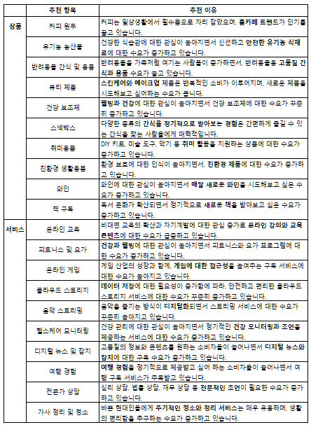 소상공인이 구독 경제 모델을 도입하여 성공하려면, 소비자의 요구와 시장의 트렌드를 반영한 유망한 상품과 서비스를 선택하는 것이 중요합니다. 다음은 AI가 구독 경제 시대에 소상공인에게 향후 유망하다고 전망하는 상품과 서비스 각각 10개에 대한 추천 사유입니다. 미래를 전망하는 소상공인에게는 이런 추천 대상을 통하여 어떤 업종에서 어떠한 상품과 서비스가 유망한가에 대한 비교로서 활용할 가치가 있습니다.