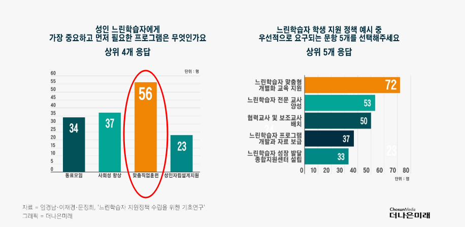 서울시 동북권 NPO 지원센터가 2019년도에 느린 학습자 학부모를 대상으로 조사한 설문조사 결과 성인 느린 학습자에게 가장 중요하고 우선적으로 필요한 지원 프로그램은 맞춤 직업 훈련이라는 응답이 가장 많았습니다. 같은 연구에서 교사들을 대상으로 필요한 정책을 물었을 때 느린 학습자를 위한 맞춤형 개별화 교육 지원이 필요하다는 응답이 많았습니다.