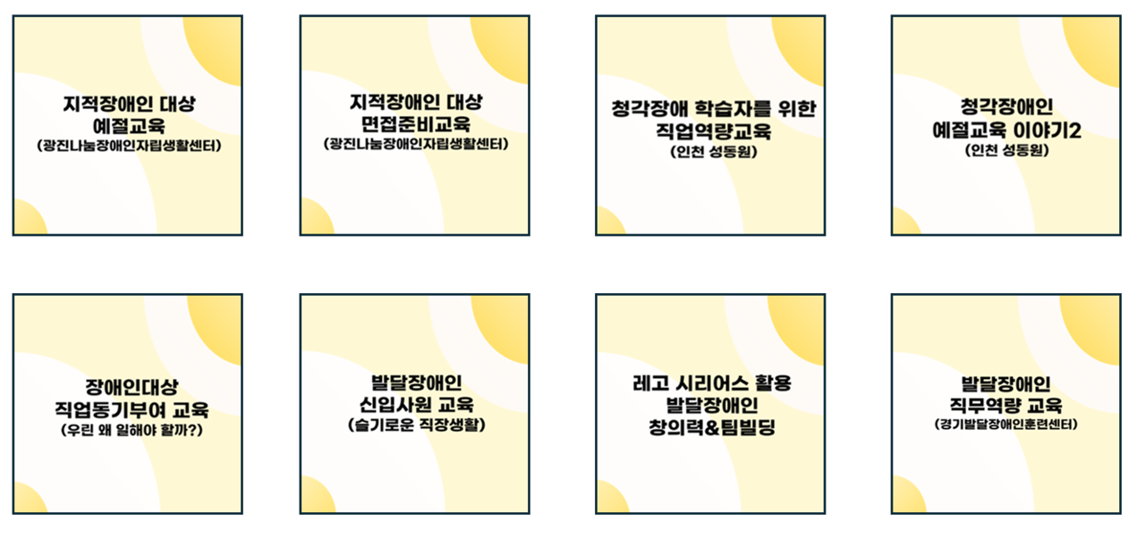 굿플레이스는 느린 학습자뿐 아니라 장애인복지 관련 기관, 특수학교, 장애인 자립시설, 장애인 가족 등 관련 기관과 가족을 대상으로 하는 프로그램도 갖추고 있습니다. 특수교육대상자 전반에 걸쳐 다양한 프로그램을 수행할 역량을 보유하고 있어 굿플레이스와 함께한다면 실질적인 성과를 이끌어낼 수 있을 것입니다.